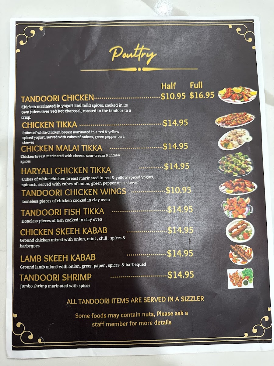 Chicken marinated in yogurt and mild spices, cooked in its own juices over red hot charcoal, roasted in the tandoor to a crisp