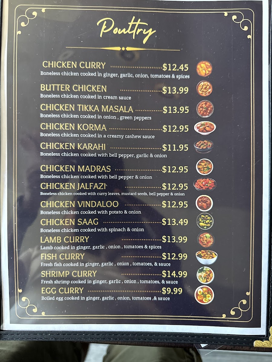 cubes of white chicken breast marinated in red & yellow spiced yogurt, spinach, served with cubes of onion, green pepper